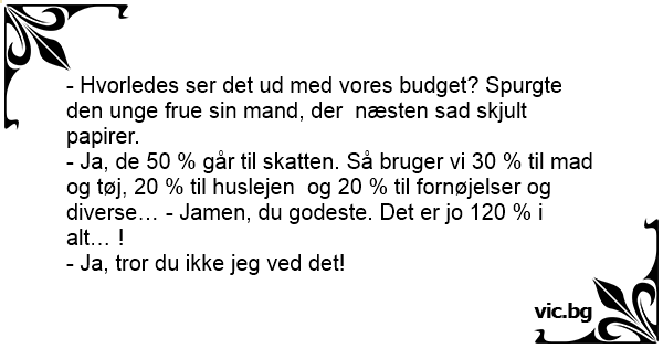 - Ja, de 50 % går til skatten. Så bruger vi 30 % til mad og tøj, 20 % til huslejen og 20 % til fornøjelser og diverse… - Jamen, du godeste. Det er jo 120 % i alt… !