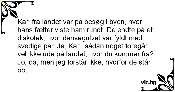 Karl fra landet var på besøg i byen, hvor hans fætter viste ham rundt. De endte på et diskotek, hvor dansegulvet var fyldt med svedige par. Ja, Karl, sådan noget foregår vel ikke ude på landet, hvor du kommer fra?