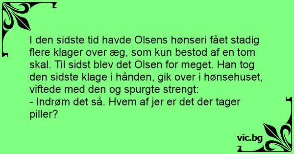 I den sidste tid havde Olsens hønseri fået stadig flere klager over æg, som kun bestod af en tom skal. Til sidst blev det Olsen for meget. Han tog den sidste klage i hånden, gik over i hønsehuset, viftede med den og spurgte strengt: - Indrøm det så. Hvem af jer er det der tager piller?