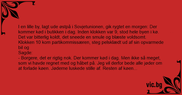 - Borgere, det er rigtig nok. Der kommer kød i dag. Men ikke så meget, som vi havde regnet med og håbet på. Jeg vil derfor bede alle jøder om at forlade køen. Jøderne luskede stille af. Resten af køen blev stående i den tiltagende kulde.