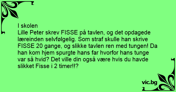 Lille Peter skrev FISSE på tavlen, og det opdagede læreinden selvfølgelig. Som straf skulle han skrive FISSE 20 gange, og slikke tavlen ren med tungen! Da han kom hjem spurgte hans far hvorfor hans tunge var så hvid? Det ville din også være hvis du havde slikket Fisse i 2 timer!!?