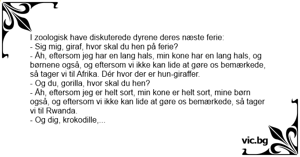 - Åh, eftersom jeg har en lang hals, min kone har en lang hals, og børnene også, og eftersom vi ikke kan lide at gøre os bemærkede, så tager vi til Afrika. Dér hvor der er hun-giraffer.