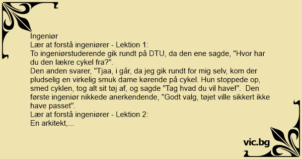 Den anden svarer, "Tjaa, i går, da jeg gik rundt for mig selv, kom der pludselig en virkelig smuk dame kørende på cykel. Нun stoppede op, smed cyklen, tog alt sit tøj af, og sagde "Tag hvad du vil have!". Den første ingeniør nikkede anerkendende, "Godt valg, tøjet ville sikkert ikke have passet".