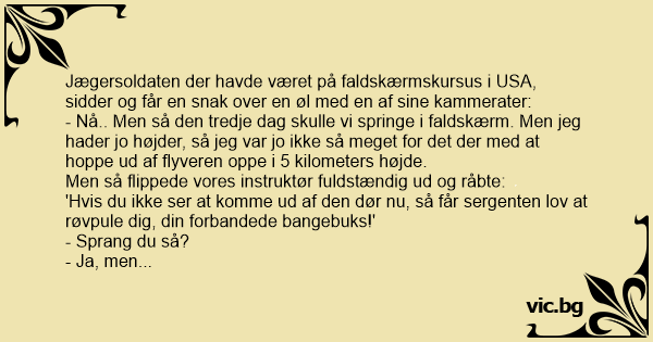 Jægersoldaten der havde været på faldskærmskursus i USA, sidder og får en snak over en øl med en af sine kammerater: