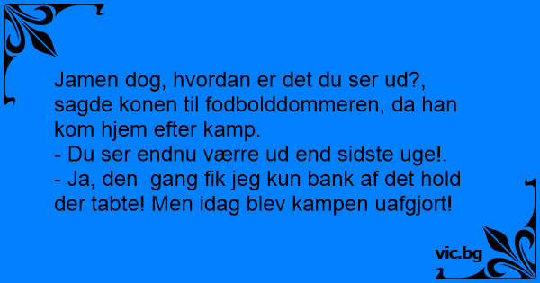 Jamen dog, hvordan er det du ser ud?, sagde konen til fodbolddommeren, da han kom hjem efter kamp.