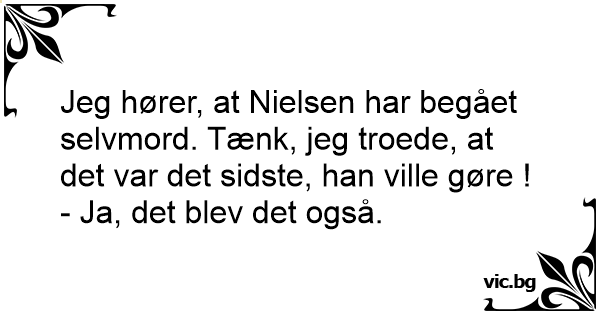 Jeg hører, at Nielsen har begået selvmord. Tænk, jeg troede, at det var det sidste, han ville gøre !