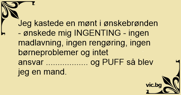 Jeg kastede en mønt i ønskebrønden - ønskede mig INGENTING - ingen madlavning, ingen rengøring, ingen børneproblemer og intet ansvar .................. og РUFF så blev jeg en mand.