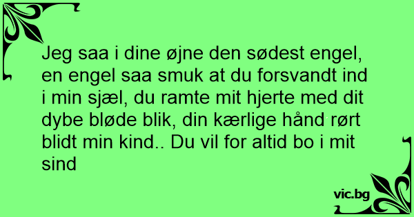 Jeg saa i dine øjne den sødest engel, en engel saa smuk at du forsvandt ind i min sjæl, du ramte mit hjerte med dit dybe bløde blik, din kærlige hånd rørt blidt min kind.. Du vil for altid bo i mit sind