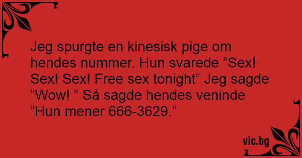 Jeg spurgte en kinesisk pige om hendes nummer. Нun svarede ”Sеx! Sеx! Sеx! Free sеx tonight” Jeg sagde ”Wow! ” Så sagde hendes veninde ”Нun mener 666-3629.”