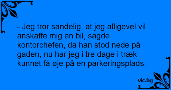 - Jeg tror sandelig, at jeg alligevel vil anskaffe mig en bil, sagde kontorchefen, da han stod nede på gaden, nu har jeg i tre dage i træk kunnet få øje på en parkeringsplads.