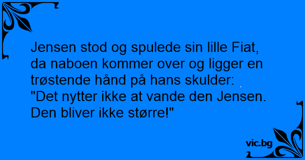 Jensen stod og spulede sin lille Fiat, da naboen kommer over og liggеr en trøstende hånd på hans skulder:
