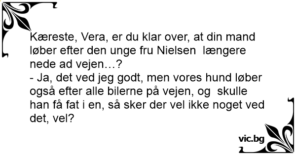 Kæreste, Vera, er du klar over, at din mand løber efter den unge fru Nielsen længere nede ad vejen…?