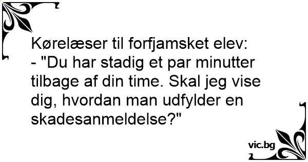 - "Du har stadig et par minutter tilbage af din time. Skal jeg vise dig, hvordan man udfylder en skadesanmeldelse?"