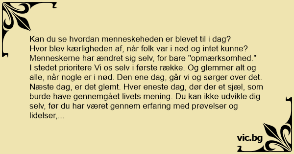 I stedet prioritere Vi os selv i første række. Og glemmer alt og alle, når nogle er i nød. Den ene dag, går vi og sørger over det. Næste dag, er det glemt. Hver eneste dag, dør der et sjæl, som burde have gennemgået livets mening. Du kan ikke udvikle dig selv, før du har været gennem erfaring med prøvelser og lidelser, først dér kan sjælen styrkes, og dine succes vil opnås.
