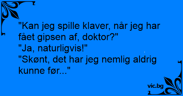 - Doctor, doctor.....dígame la verdad, después de la operación podré tocar la guitarra ? - Si hombre, perfectamente. - Que bien !!!porque antes no sabía. Lilian gick till Doktorn för stela leder. Hon fick en salva att smörja med och ett träningsprogram att göra framför Tven. - Kom tillbaka efter två veckor, sa Doktorn. Det blev bättre och vid... Mannen till läkarn: - Tror du jag kan spela fiol när armen är läkt? - Inga problem, svarade läkaren - Vad bra, för det kunde jag inte innan Преди операция блондинка пита доктора: - А след операцията ще мога ли да свиря на пиано? - Разбира се, че ще можете - отговорил доктора. - Уха! Супер! А сега не мога! - казала блондинката. - Доктор, скажите, я смогу играть на скрипке после операции? - Да, сможете. - Круто! А ведь раньше не мог. En mann hadde ødelagt fingeren sin, og oppsøkte en lege for å få sydd på tuppen igjen. Da han var ferdig, spurte mannen: - Kan jeg spille fiolin nå ? - Ja da, svarte legen, - nå kan du spille... Хворий на операційному столі до хірурга: - Скажіть, лікарю, я після операції зможу грати на скрипці? - Та заспокойтеся! Зможете, зможете. - Дивно! А до операції не вмів. - Докторе, ќе можам ли да свирам виолина по операцијата? - Секако. - Еј супер, досега не можев!