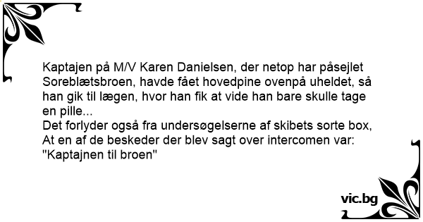 Kaptajen på M/V Karen Danielsen, der netop har påsejlet Soreblætsbroen, havde fået hovedpine ovenpå uheldet, så han gik til lægen, hvor han fik at vide han bare skulle tage en pille...