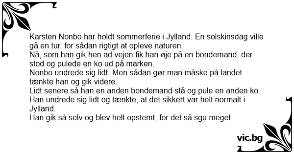 Lidt senere så han en anden bondemand stå og pule en anden ko. Han undrede sig lidt og tænkte, at det sikkert var helt normalt i Jylland.