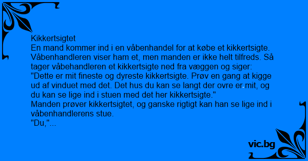 En mand kommer ind i en våbenhandel for at købe et kikkertsigte. Våbenhandleren viser ham et, men manden er ikke helt tilfreds. Så tager våbehandleren et kikkertsigte ned fra væggen og siger: