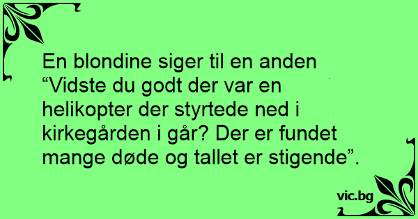 En blondine siger til en anden “Vidste du godt der var en helikopter der styrtede ned i kirkegården i går? Der er fundet mange døde og tallet er stigende”.