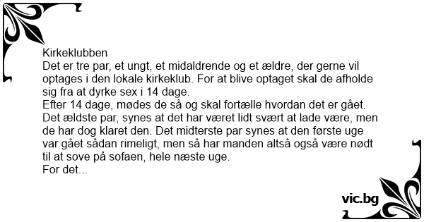 Drie echtparen, een bejaard, een van middelbare leeftijd en een net getrouwd stel willen toetreden tot een kerk. De priester vertelt: "We stellen speciale eisen aan nieuwe parochianen: Je mag twee...