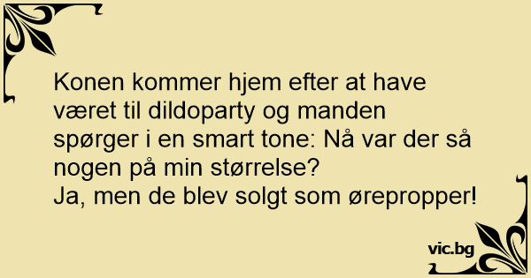Konen kommer hjem efter at have været til dildoparty og manden spørger i en smart tone: Nå var der så nogen på min størrelse?