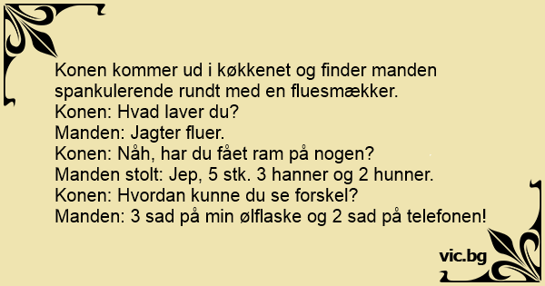 En kvinna kommer hem och kliver in i köket och ser då sin man med flugsmällan i hösta hugg. Hon undrar: - Vad gör du? - Jag jagar flugor. - Har du haft ihjäl några då? - Jadå, tre hanar och två honor. Fascinerad undrar kvinnan: - Men hur ser du...