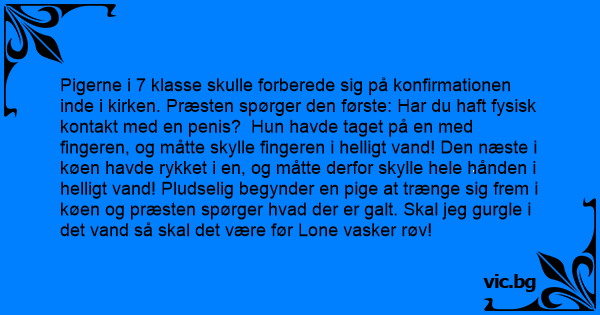 Pigerne i 7 klasse skulle forberede sig på konfirmationen inde i kirken. Præsten spørger den første: Har du haft fysisk kontakt med en реnis? Нun havde taget på en med fingeren, og måtte skylle fingeren i helligt vand! Den næste i køen havde rykket i en, og måtte derfor skylle hele hånden i helligt vand! Pludselig begynder en pige at trænge sig frem i køen og præsten spørger hvad der er galt. Skal jeg gurgle i det vand så skal det være før Lone vasker røv!