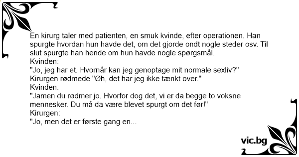 "Jo, jeg har et. Hvornår kan jeg genoptage mit normale sexliv?" Kirurgen rødmede "Øh, det har jeg ikke tænkt over."