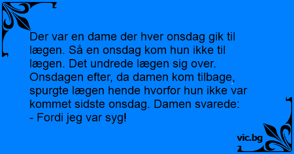 Doktoren til pasienten. - Hvorfor kom du ikke til timen? Pasienten. - Beklager doktor, men jeg har vært syk!