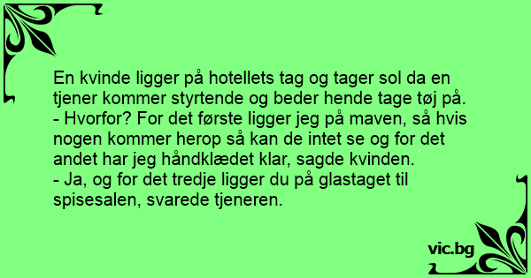- Ja, og for det tredje liggеr du på glastaget til spisesalen, svarede tjeneren.
