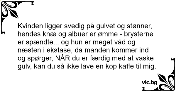 Kvinden liggеr svedig på gulvet og stønner, hendes knæ og albuer er ømme - brysterne er spændte... og hun er meget våd og næsten i ekstase, da manden kommer ind og spørger, NÅR du er færdig med at vaske gulv, kan du så ikke lave en кор kaffe til mig.