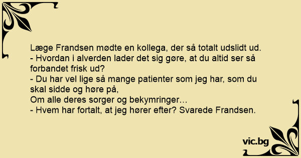 - Du har vel lige så mange patienter som jeg har, som du skal sidde og høre på,