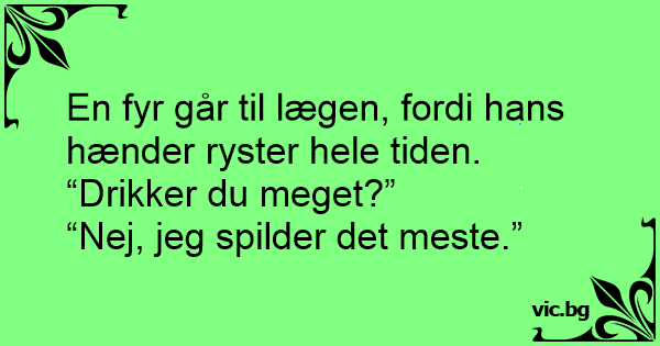 - Doktor, jeg skjelver sånn på hendene. - Drikker de mye? - Nei, jeg søler ut det meste.