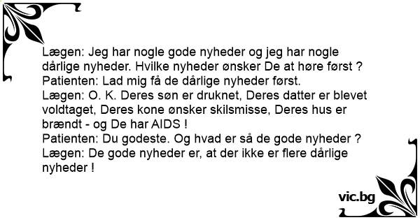 Lægen: Jeg har nogle gode nyheder og jeg har nogle dårlige nyheder. Hvilke nyheder ønsker De at høre først ?