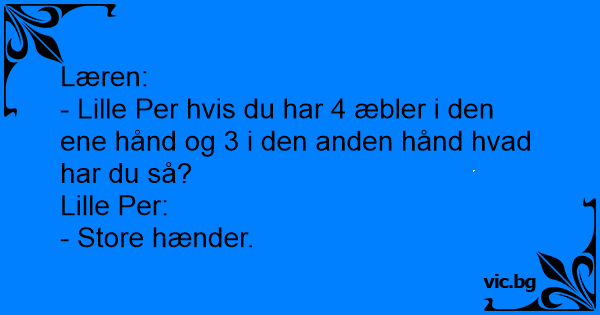 - Vad har du om du har fem äpplen i ena handen och sju äpplen i andra handen?fråga läraren Pelle. - Ovanligt stora händer?svarade han...