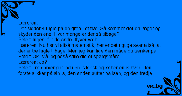 Peter: Tre damer går ind i en is kiosk og køber en is hver. Den første slikker på sin is, den anden sutter på isen, og den tredje bider af sin.