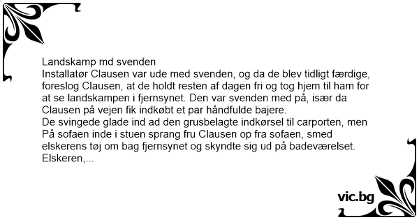 Installatør Clausen var ude med svenden, og da de blev tidligt færdige, foreslog Clausen, at de holdt resten af dagen fri og tog hjem til ham for at se landskampen i fjernsynet. Den var svenden med på, især da Clausen på vejen fik indkøbt et par håndfulde bajere.