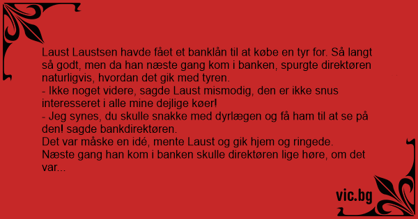 Laust Laustsen havde fået et banklån til at købe en tyr for. Så langt så godt, men da han næste gang kom i banken, spurgte direktøren naturligvis, hvordan det gik med tyren.