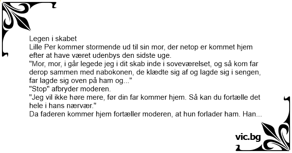 "Mor, mor, i går legede jeg i dit skab inde i soveværelset, og så kom far derop sammen med nabokonen, de klædte sig af og lagde sig i sengen, far lagde sig oven på ham og..."
