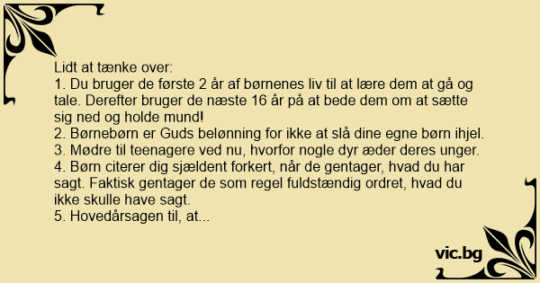 1. Du bruger de første 2 år af børnenes liv til at lære dem at gå og tale. Derefter bruger de næste 16 år på at bede dem om at sætte sig ned og holde mund!