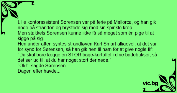 Lille kontorassistent Sørensen var på ferie på Mallorca, og han gik nede på stranden og brystede sig med sin spinkle krop.