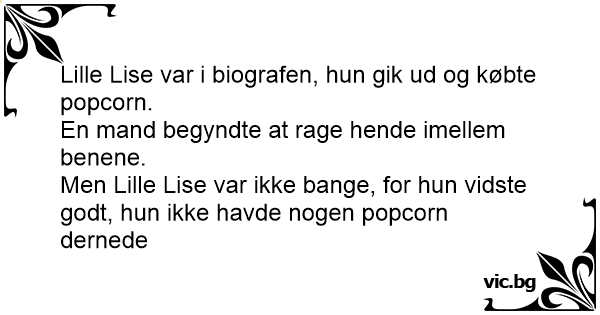 Lille Lise var i biografen, hun gik ud og købte popcorn.