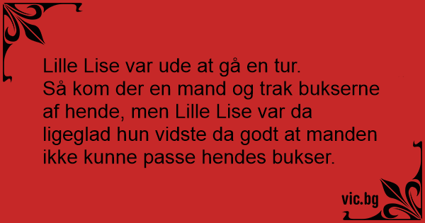 Så kom der en mand og trak bukserne af hende, men Lille Lise var da ligeglad hun vidste da godt at manden ikke kunne passe hendes bukser.