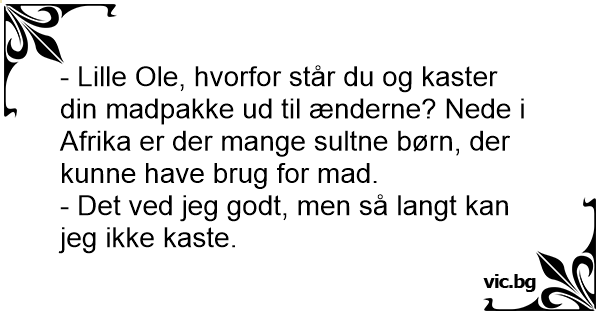 - Lille Ole, hvorfor står du og kaster din madpakke ud til ænderne? Nede i Afrika er der mange sultne børn, der kunne have brug for mad.