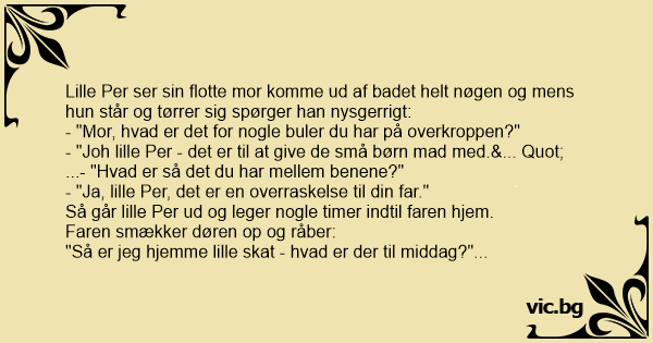 Lille Per ser sin flotte mor komme ud af badet helt nøgen og mens hun står og tørrer sig spørger han nysgerrigt: