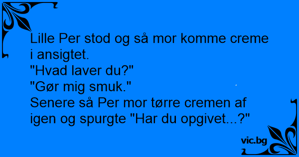 Senere så Per mor tørre cremen af igen og spurgte "Har du opgivet...?"