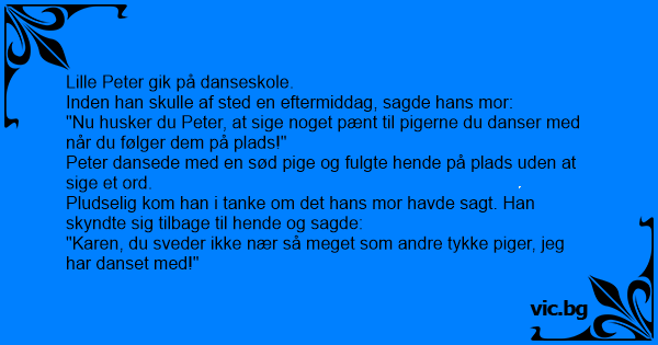 "Nu husker du Peter, at sige noget pænt til pigerne du danser med når du følger dem på plads!"