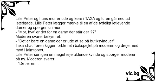 Lille Peter og hans mor er ude og køre i TAXA og turen går ned ad Istedgade. Lille Peter lægger mærke til en af de tydeligt letlevende damer og spørger sin mor: