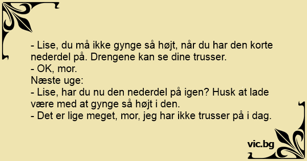 - Lise, du må ikke gynge så højt, når du har den korte nederdel på. Drengene kan se dine trusser.