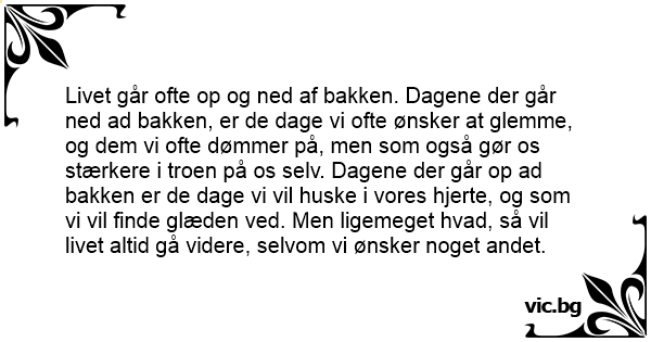Livet går ofte op og ned af bakken. Dagene der går ned ad bakken, er de dage vi ofte ønsker at glemme, og dem vi ofte dømmer på, men som også gør os stærkere i troen på os selv. Dagene der går op ad bakken er de dage vi vil huske i vores hjerte, og som vi vil finde glæden ved. Men ligemeget hvad, så vil livet altid gå videre, selvom vi ønsker noget andet.